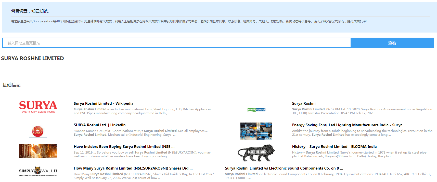 易之家通過采集Google yahoo等48個(gè)知名搜索引擎和海量精準(zhǔn)外貿(mào)大數(shù)據(jù),利用人工智能算法在網(wǎng)絡(luò)大數(shù)據(jù)平臺(tái)中獲取信息形成公司畫像,包括公司基本信息、聯(lián)系信息、社交賬號(hào)、關(guān)鍵人、數(shù)據(jù)分析、新聞動(dòng)態(tài)等信息等。深入了解買家公司情況,提高成交機(jī)率!