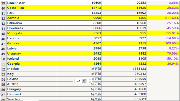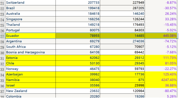 3. 南美的厄瓜多爾,智利,烏拉圭、哥斯達(dá)黎加均出現(xiàn)了不俗的表現(xiàn),尤其厄瓜多爾增長(zhǎng)幅度 445%。