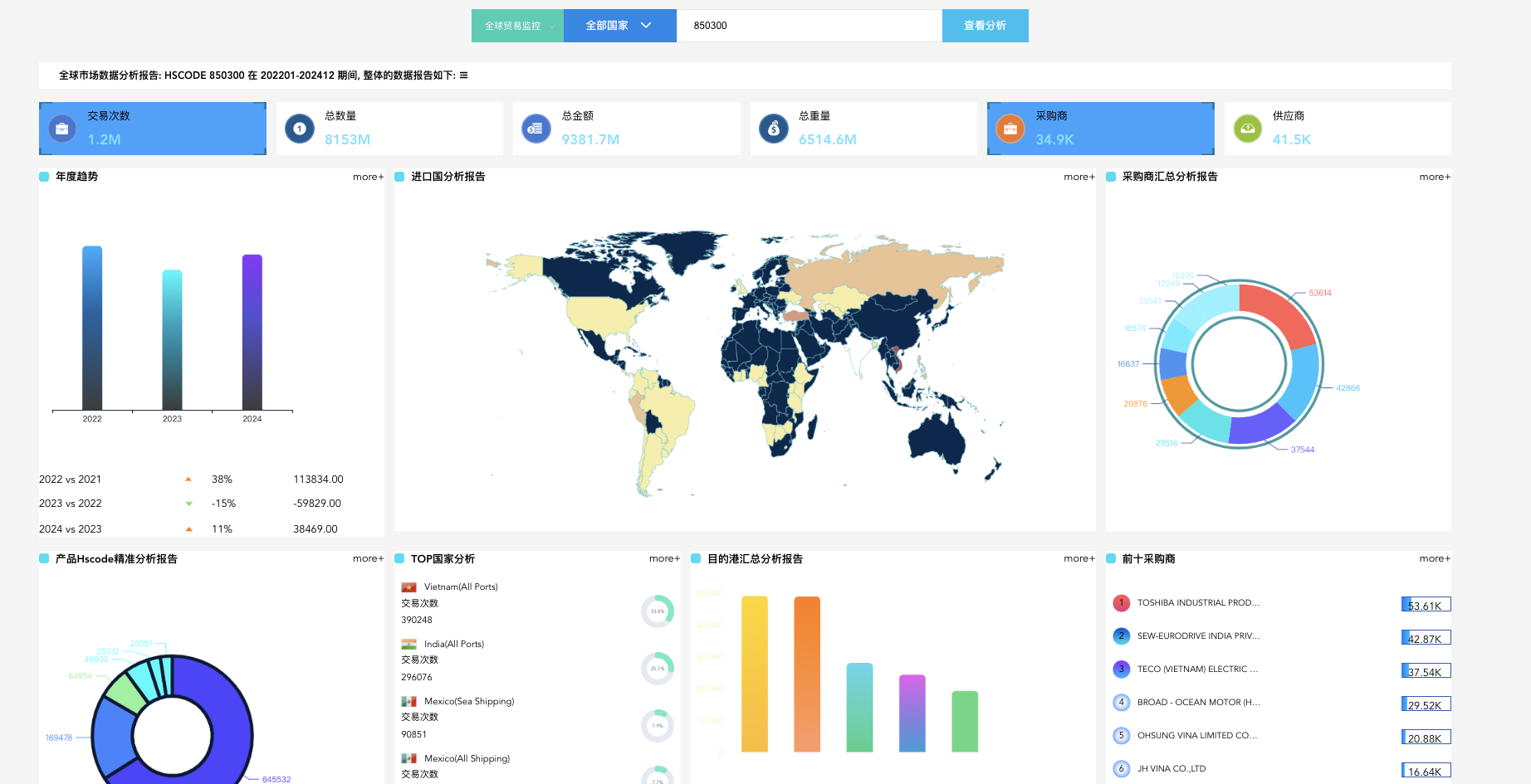 1.15+年外貿(mào)數(shù)據(jù)沉淀:覆蓋94億美金金額的電機(jī)配件交易數(shù)據(jù),1億+全球企業(yè)庫(kù)。