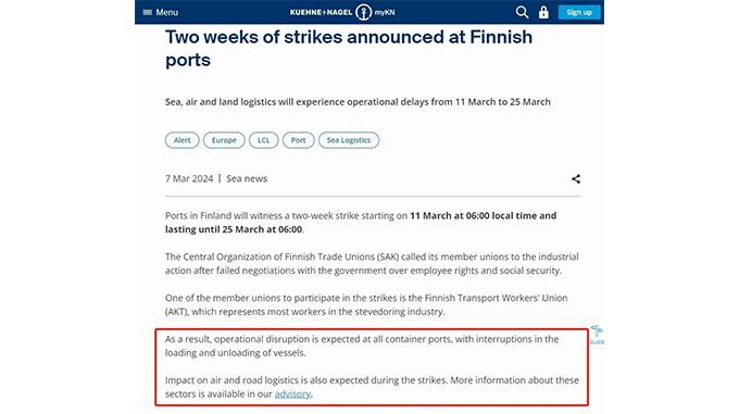 3月7日,貨代巨頭企業(yè)德迅在其官方網(wǎng)站上也發(fā)布了一份預(yù)警通知。表示由于大量代表裝卸行業(yè)的工人計(jì)劃參與罷工,預(yù)計(jì)芬蘭的所有集裝箱港口運(yùn)營將陷入停滯,船舶裝卸作業(yè)也將被迫中止。此外,罷工期間還將對(duì)空運(yùn)和公路物流產(chǎn)生一定影響。