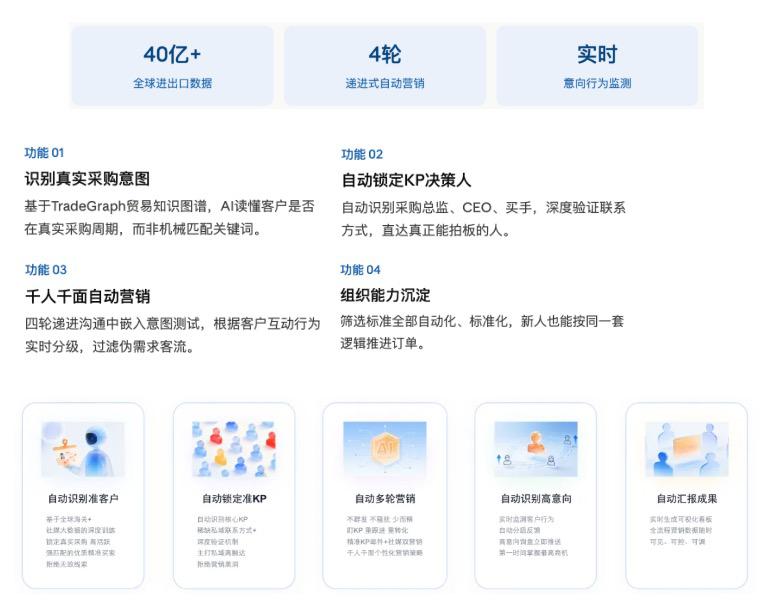 易之家GPM-AI智體,正是為了解決這個問題而生。它不依賴任何一個人的經驗,而是基于真實的全球貿易數據和行為信號,幫你自動完成「找到真實買家→鎖定決策人→遞進跟進→意向分級」的全流程。