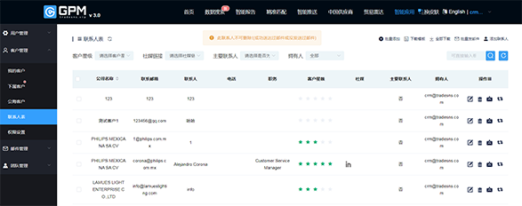 那么本次我們新增了一個聯(lián)系人表,這個是之前用戶需求比較多的,他們想要一個集合的所有的聯(lián)系人的一個表的位置。那么聯(lián)系人表就是所有收藏客戶中的聯(lián)系人的一個匯總情況。然后我們可以進行一個在線的編輯修改,然后可以批量添加,也支持一鍵下載,群發(fā)郵件。