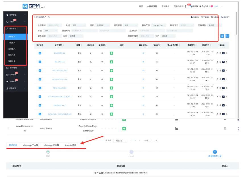 GPM-AI智能體同樣集成了功能全面的CRM客戶管理系統(tǒng),對不同意向客戶分級管理,WhatsApp、Linkedin聊天記錄也可以同步更新到CRM中, 讓您對每個(gè)客戶的合作進(jìn)展都了然于胸。
