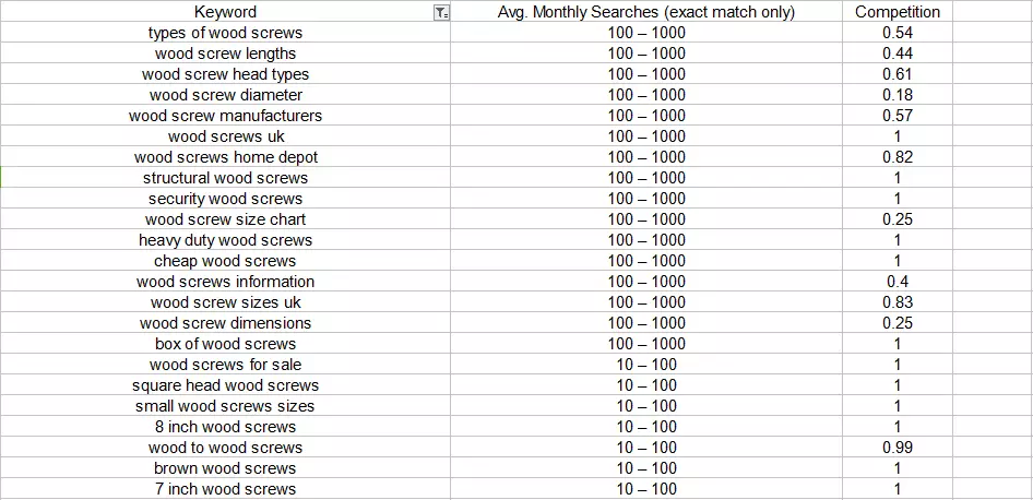 3 . 篩選完畢之后,剩下的就全部是包含wood screw的長尾關(guān)鍵詞。最后,將第2列(平均搜索量/月)的數(shù)據(jù)按照降序排列,這樣就可以找到搜索量很大的長尾關(guān)鍵詞。