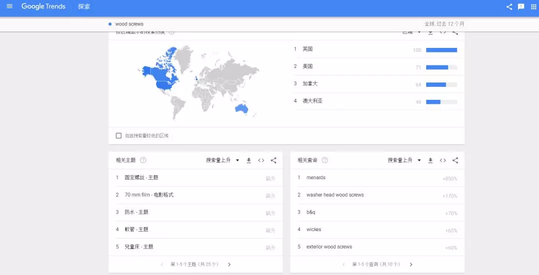 同時(shí),大家可以自己更換搜索條件。比如,我想看看:wood screw這個(gè)產(chǎn)品,在英國,在過去5年內(nèi),在房地產(chǎn)行業(yè),通過Google搜索的國際趨勢(shì)。大家就可以自己選擇查詢條件,查看產(chǎn)品搜索趨勢(shì)。