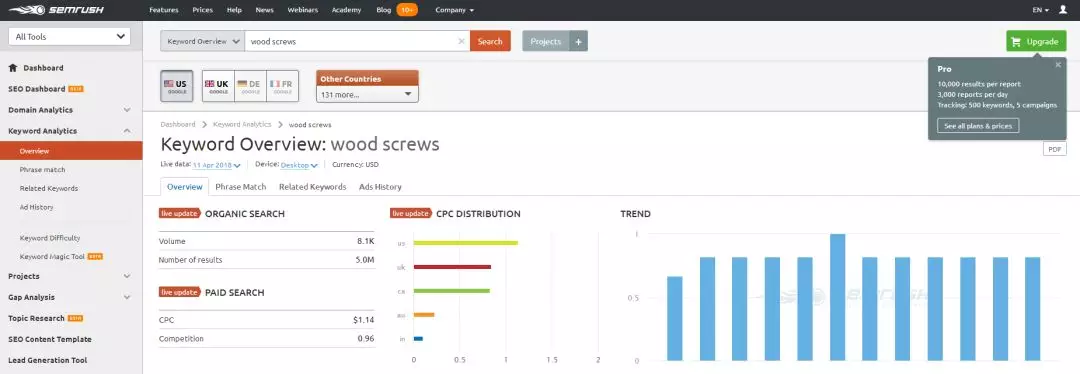 以上就是,Semrush在做產(chǎn)品國際趨勢(shì)分析中的基本應(yīng)用。在這里需要做特殊說明的是,Semrush免費(fèi)版每天的搜索次數(shù)是受限的,而且搜索的數(shù)據(jù)也是受限的,不方便全面分析產(chǎn)品。
