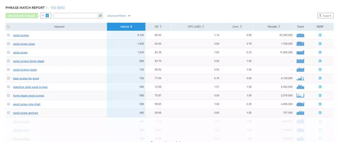 2 . 選擇Phrase Match Report(相關(guān)詞組報(bào)告),可以看到包含wood screw的長尾詞的相關(guān)數(shù)據(jù):月均搜索量、自然優(yōu)化難以程度、付費(fèi)競價(jià)建議出價(jià)、競爭度、索引量、趨勢(shì)。