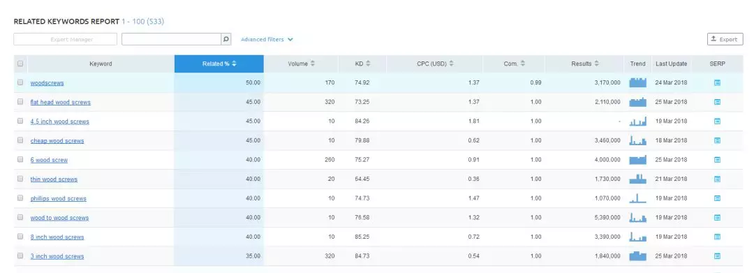 注意:Related Keywords Report與Phrase Match Report不同之處在于:前者是與wood screw相關(guān)的詞,但是不一定包含wood screw;后者,是來自wood screw 匹配出來的詞組,包含wood screw。