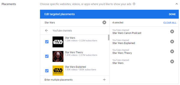 這意味著,如果你在廣告組定位中添加了其他要素(例如主題、關(guān)鍵字、受眾等),并且你沒有資格出現(xiàn)在你所選擇的YouTube廣告位上(可能是由于競爭激烈),那么展示廣告可能會出現(xiàn)在許多其他的你意想不到的替代廣告位上。但一定程度,這個問題你可以在監(jiān)控過程中加以解決。