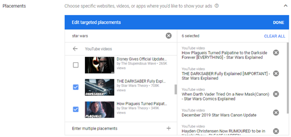 然后,將視頻ID粘貼到廣告位搜索功能中,以嘗試查找視頻來作為你的廣告組想要定位的廣告位。之所以說“嘗試查找”是因為并非每個視頻都有資格展示廣告。如果你按頻道、視頻或視頻ID搜索特定視頻,但沒有看到預(yù)期的廣告位結(jié)果,則很可能意味著這些YouTube廣告位不適合Display Network中的廣告。在這種情況下,你需要搜索替代視頻以投放廣告。