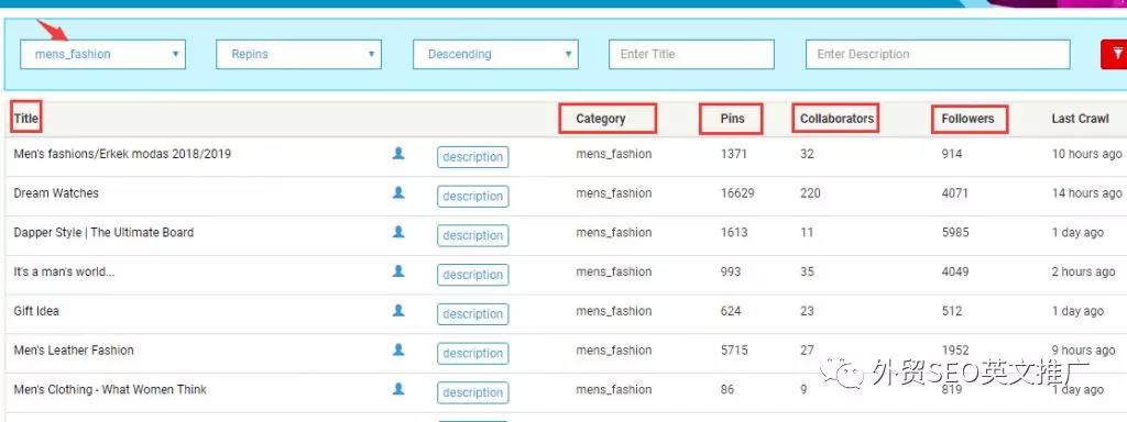 選定Title,選擇結(jié)果的排序方式(建議按照repins數(shù)來篩選,repin高的極大程度上是優(yōu)質(zhì)group board),以及簡單的描述等就可以了。