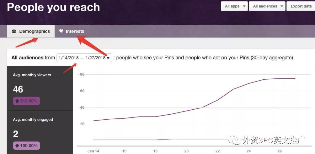 People you reach(Pins的受眾):每月平均有多少人看了你的Pisn,有多少人進行了互動;