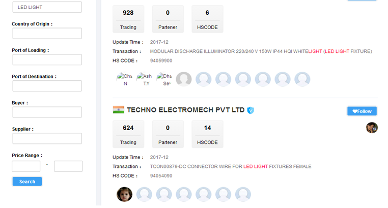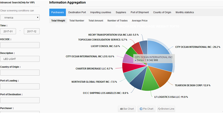At this time the following page shows theUnited States 2017 product data situation of LED Light. You can see 3,694buyers, 3,558 suppliers, and the customs declaration data 19,120 (the customs declaration data refers to the detailed transaction of each ticket data).