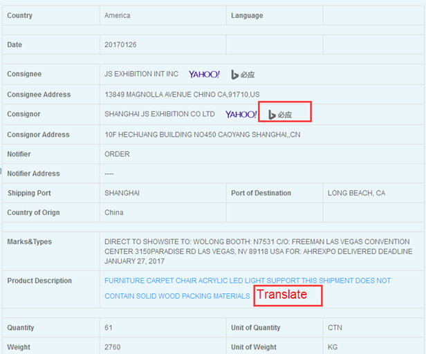 The following figure is the most detailedone-vote transaction information for US data, in which our company uses Bing orYahoo search engines to make it easier for customers to use search engines todirectly search for more information about their buyers online. Also has thetranslation software, clicks the red "translates", online translationdirectly.